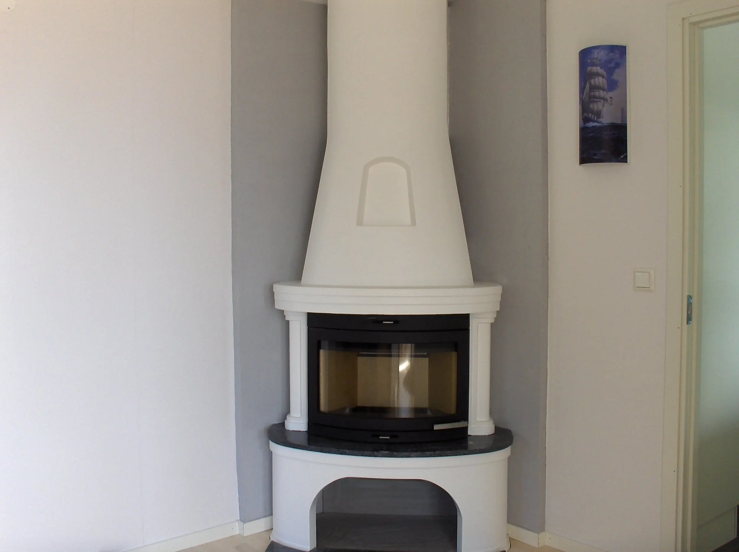 Öppen spis i allrummet på bottenvåningen